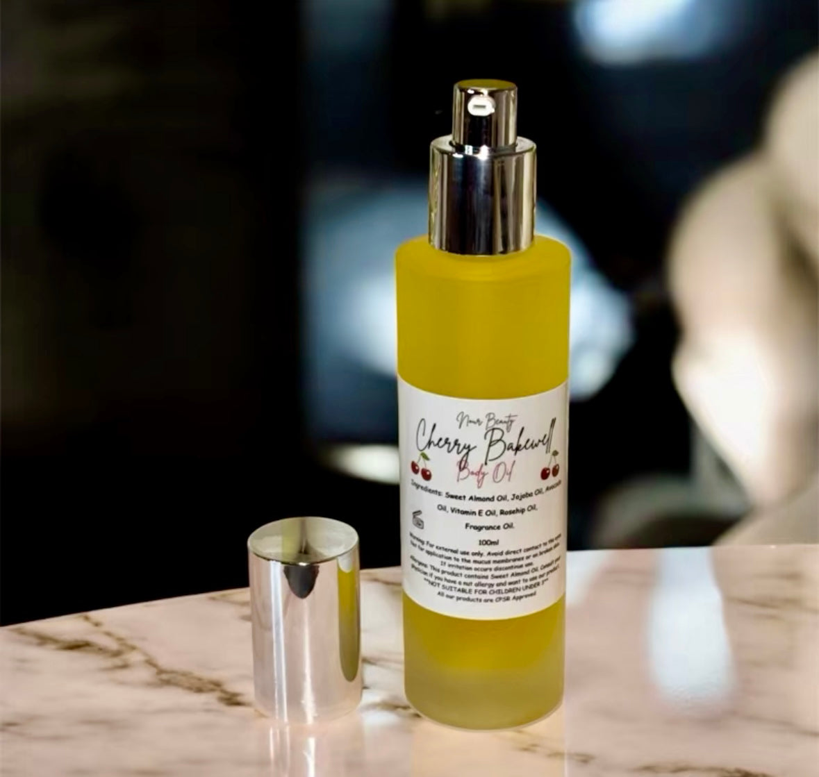 - Materials: Jojoba oil, vitamin e oil, sweet almond oil, Rosehip oil, avocado body oil, and Cherry Bakewell fragrance oil
