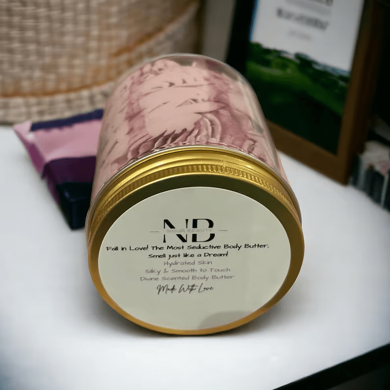 - Materials: Shea Butter, Kokum butter, vitamin e oil, jim choo fragrance oil, coconut oil, arrowroot powder, Sweet Almond Oil, Mica Powder